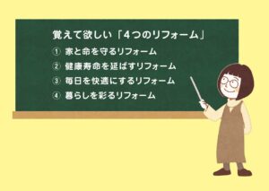 さまざまなリフォームも、大きくは「4つのリフォーム」に分けることができます。その中でも最も大切なのは、家の安全性と耐久性を高めること、次に健康で長く暮らせる居住空間にすることです。その上で毎日の生活が便利で快適になるように改善をしたり、内装やデザインを新しくすることで満足度を高める。この順序が後悔をしないリフォーム計画のポイントであると私は考えます。