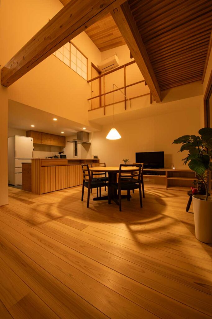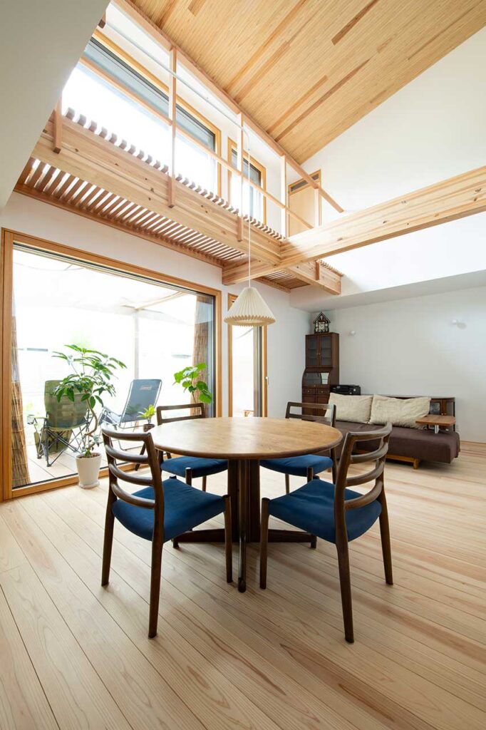 吹抜の勾配天井の杉の羽目板も味わいがあります。