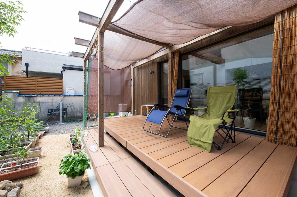 デッキと木製パーゴラに日除けのターフを付けています。日射遮蔽もできるだけ機械に頼らない、手の届く1階はよしずをたてます。