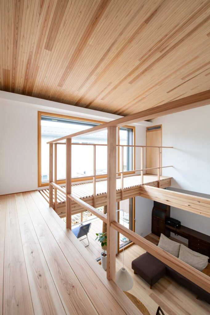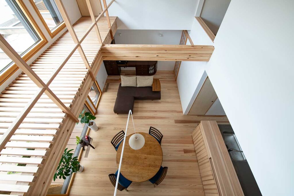 キャットウォークからの眺めです。大きな吹き抜けでありながら緻密な構造ブロック体を考え耐震計算をしっかりと行なっています。
