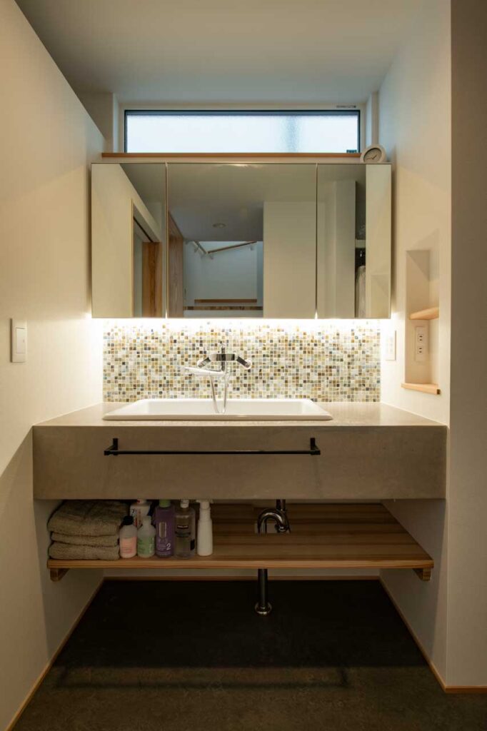 毎朝の洗顔が楽しくなる綺麗なモザイクタイルと機能性を兼ね備えた造作洗面化粧台。シンプルでいて、水栓の根本も水浸しにならない、ニッチ周りにもたくさんのコンセント(最新の家電やウエアラブル達にも十分な対応ができるよう)綿密な打ち合わせを行っています。