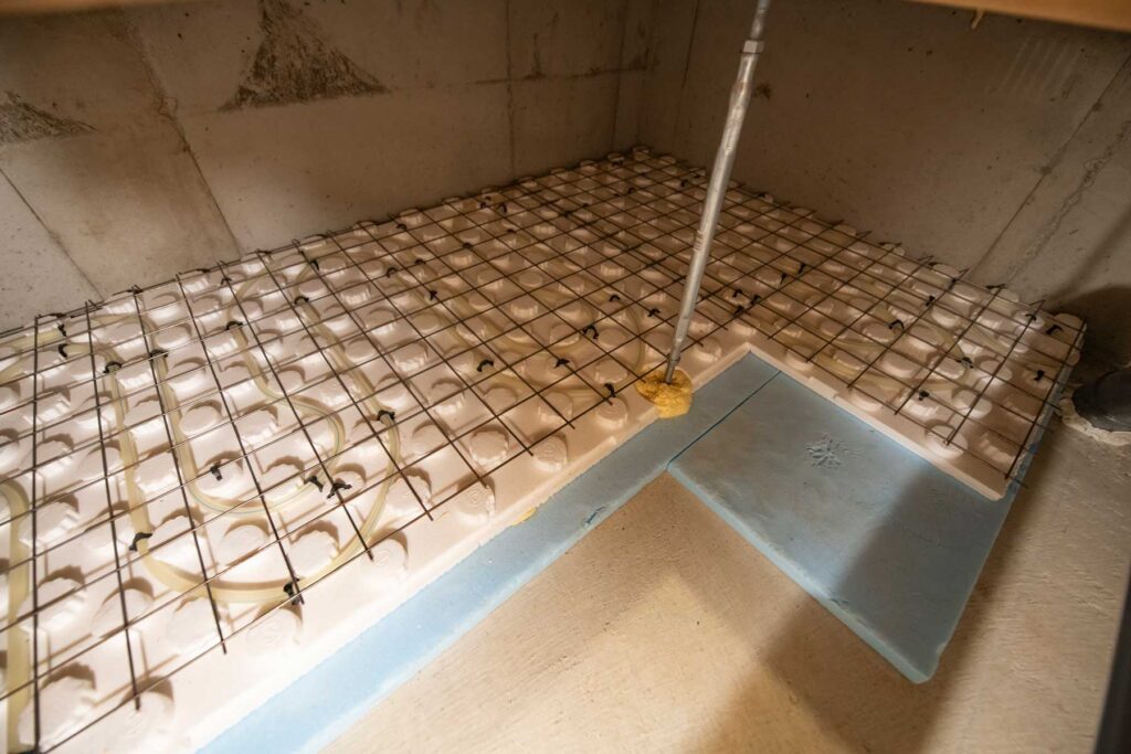 床下のコンクリートスラブの上にチューブ温水暖房。本来これはコンクリート床などに埋め込まれるものを敢えてメンテナンスのためむき出しに。将来簡単に取り替えができます。この暖房は何と言っても音が出ない、風も出ない。理想的な暖房です。