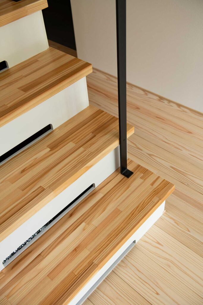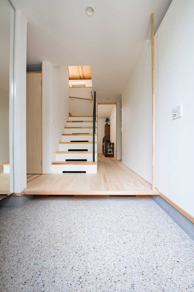目に優しい洗い出しの土間とぬくもりのある無垢の杉板の床が落ち着きます。階段の蹴込のスリットは実は階段下の機械に頼らない空調スペースからの空気の行き来に使っています。