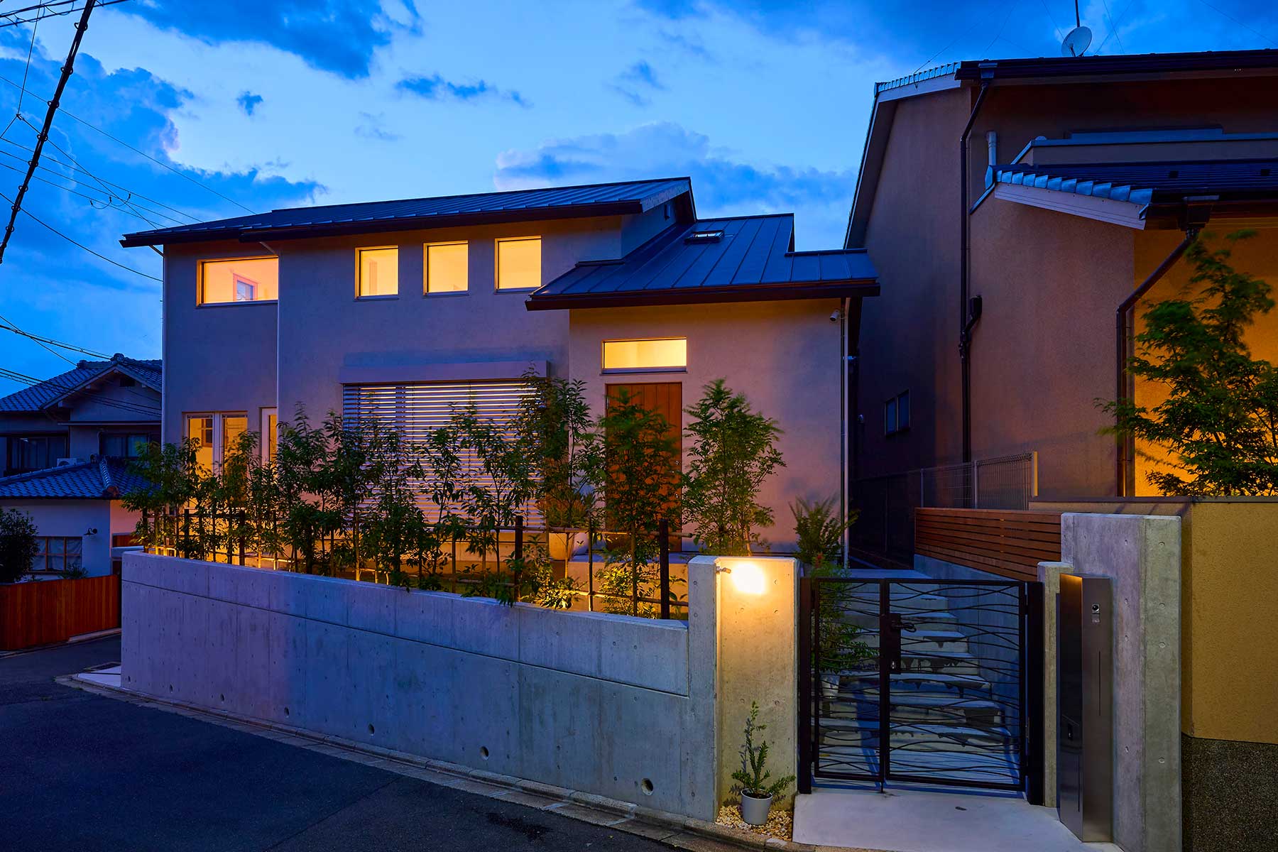ガレージのレッドシダー製跳ね上げ扉、小舞竹をあしらった和のスペース、グランドピアノのための防音室など、ご家族のこだわりを余すことなく実現した一邸です。