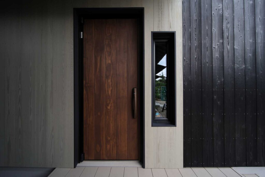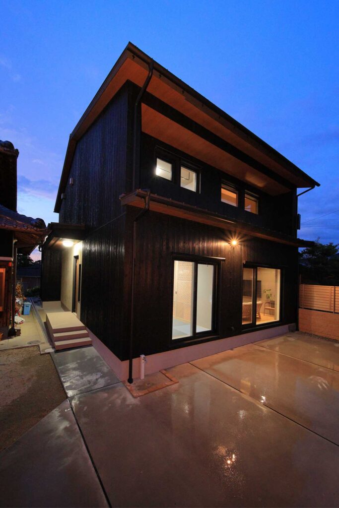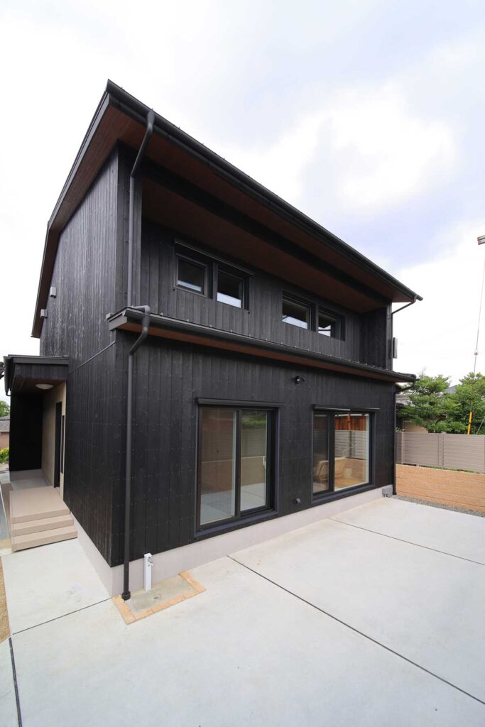 焼杉を基調とした外観。地域と立地に対し、日射取得と日射遮蔽のバランスを詳細に検討し窓を配置しています。