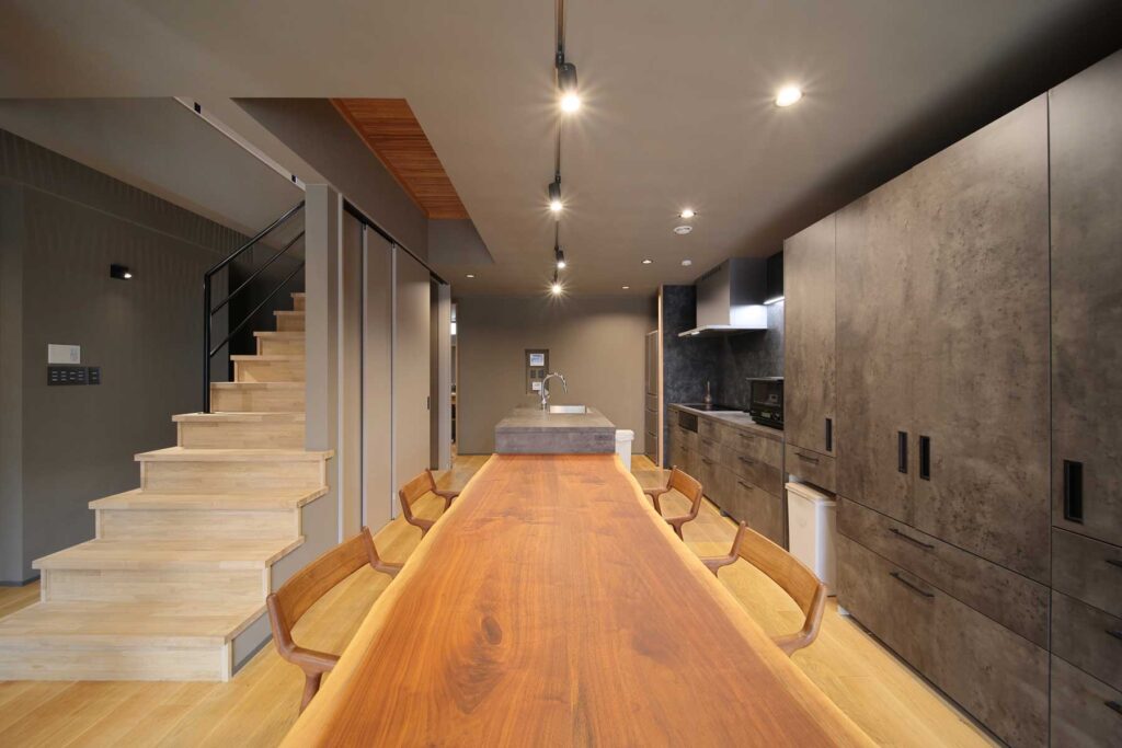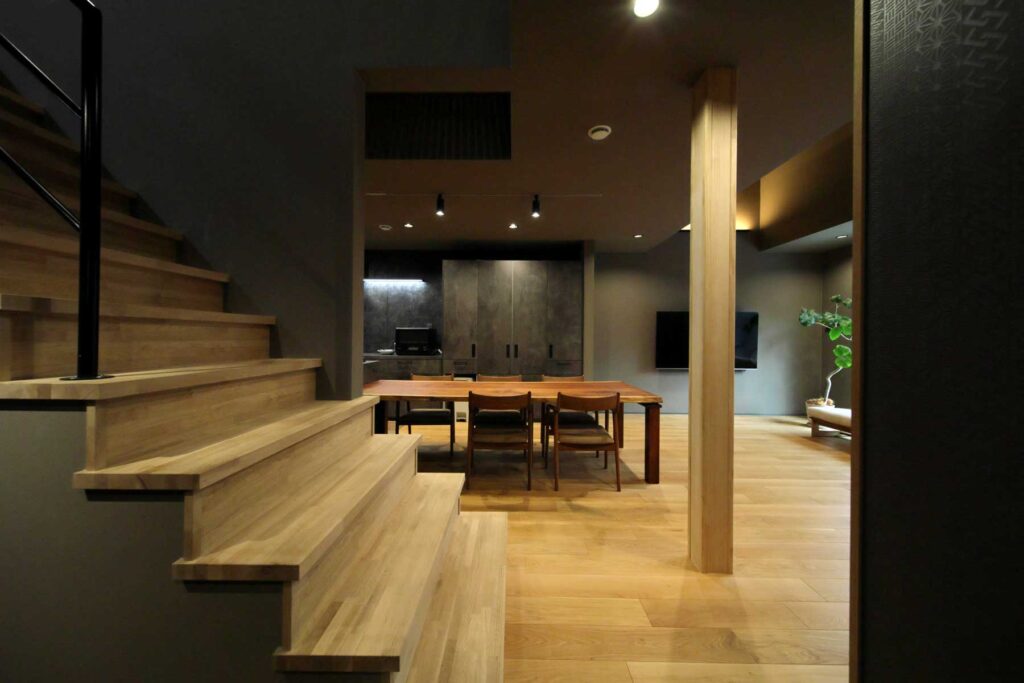 世界水準の高断熱・高気密性能と全館連続冷暖房システムにより、家中の温度差をなくし、広々としたオープンな間取りを実現しました。間取りは、玄関からリビング・ダイニングまで視線が抜ける回遊動線を採用。アイアン手摺をあしらった軽やかな階段や、空間のアクセントとなる大黒柱が印象的な、デザイン性の高い開放的な空間です。