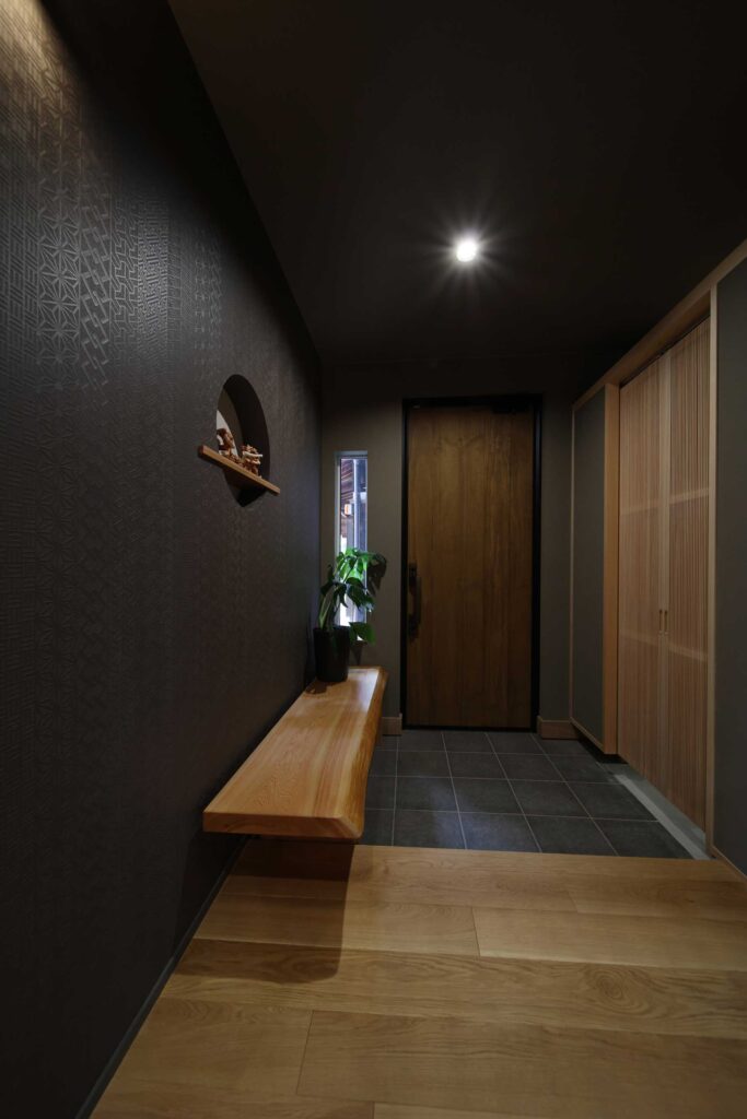 和モダンの玄関。丸窓のようなニッチと腰掛けも木の香りが漂います。