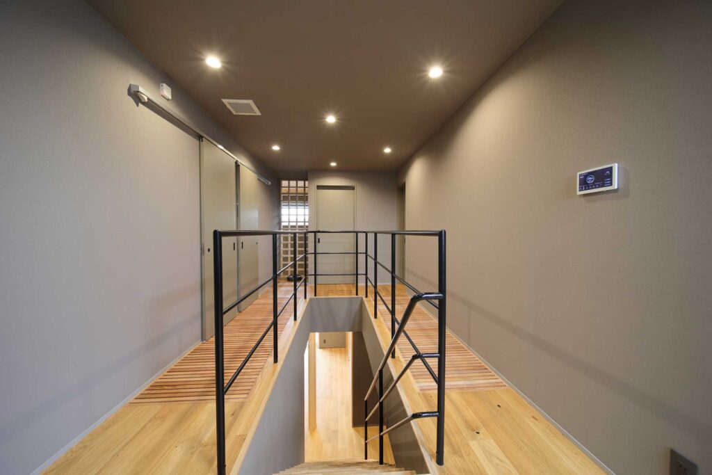 床の木のガラリと奥の吹き抜けに通ずる格子。超高断熱のお家で家中均一な温湿度が保たれ快適に。