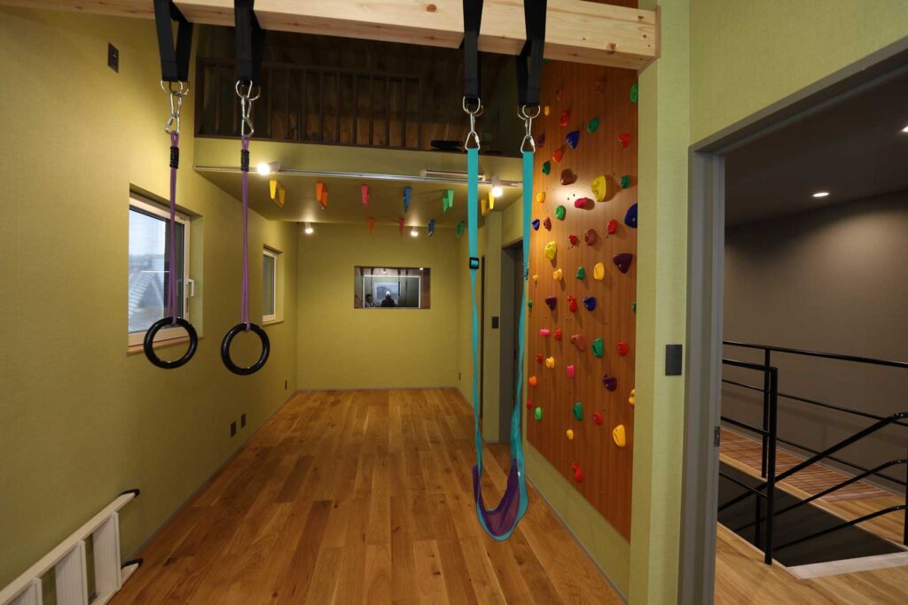 2階の将来仕切れる子供部屋は今はのびのびとロッククライミングにブランコにうんていもあり。(ロフトにも上れる)雨の日も活発に遊べる。吹き抜けを通して1階との気配も感じられる。
