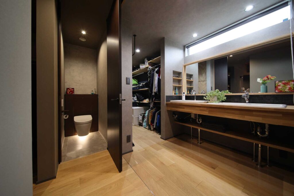 バックヤードとしてのファミリークローゼット(途中にトイレ)~洗面室~脱衣室~浴室の流れも大変効率が良く、途中の洗面室のみオープンでツーボール・大きな鏡・自動水栓の造作洗面台で機能的であります。