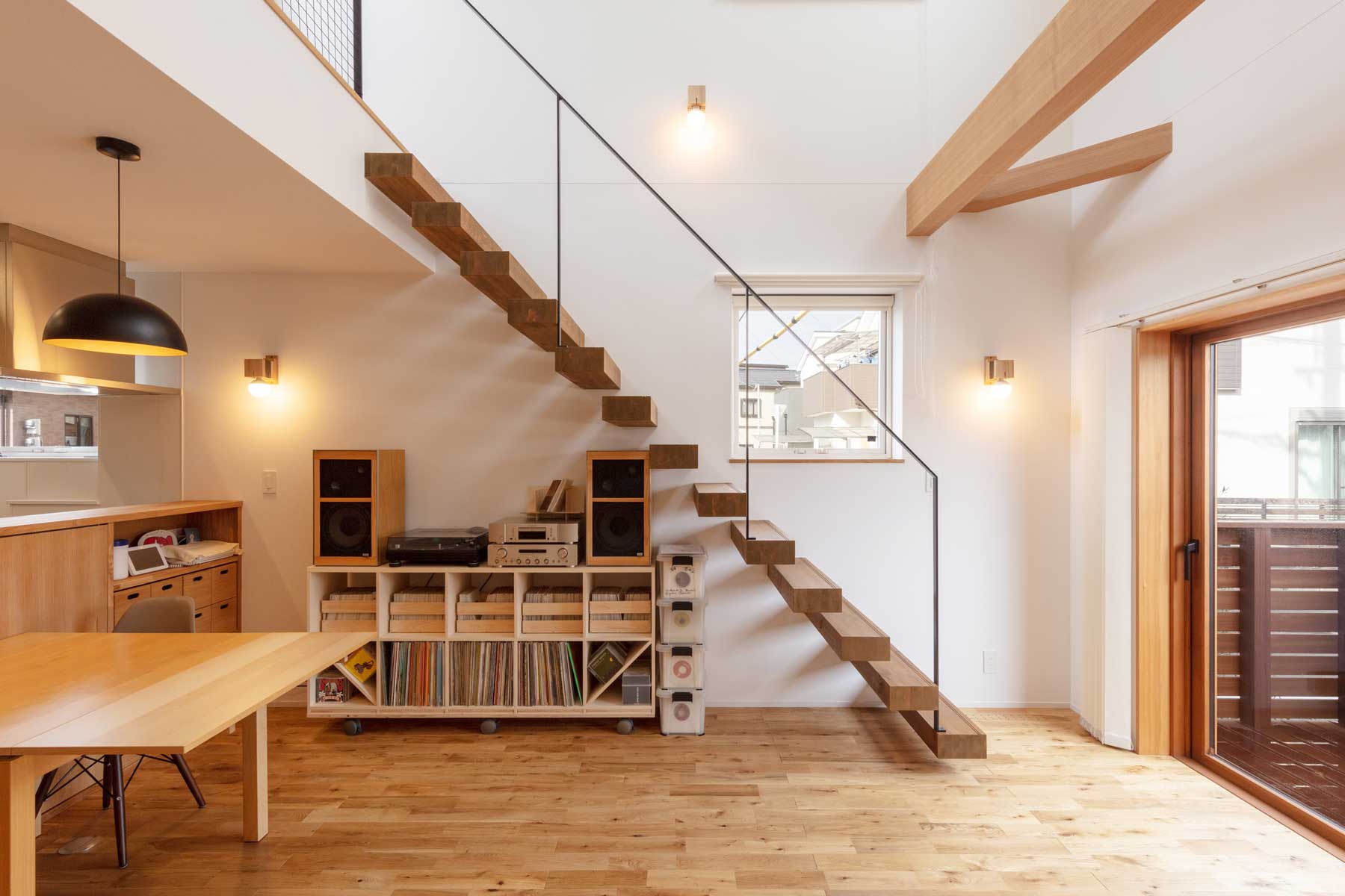 吹き抜け空間には、踏み板のみが壁から浮いているようなスケルトン階段(箱階段)が設置されており、空間の光や視線を遮らず、縦の繋がりを強調しています。